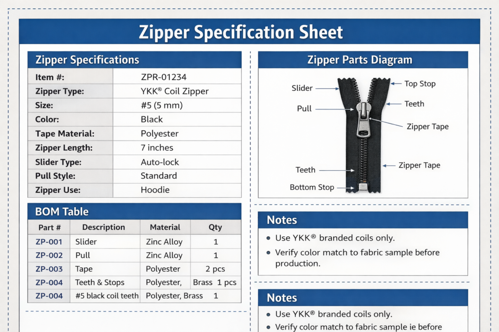 Because a zipper contains multiple structural components, every detail — from teeth type to slider finish — must be documented precisely.